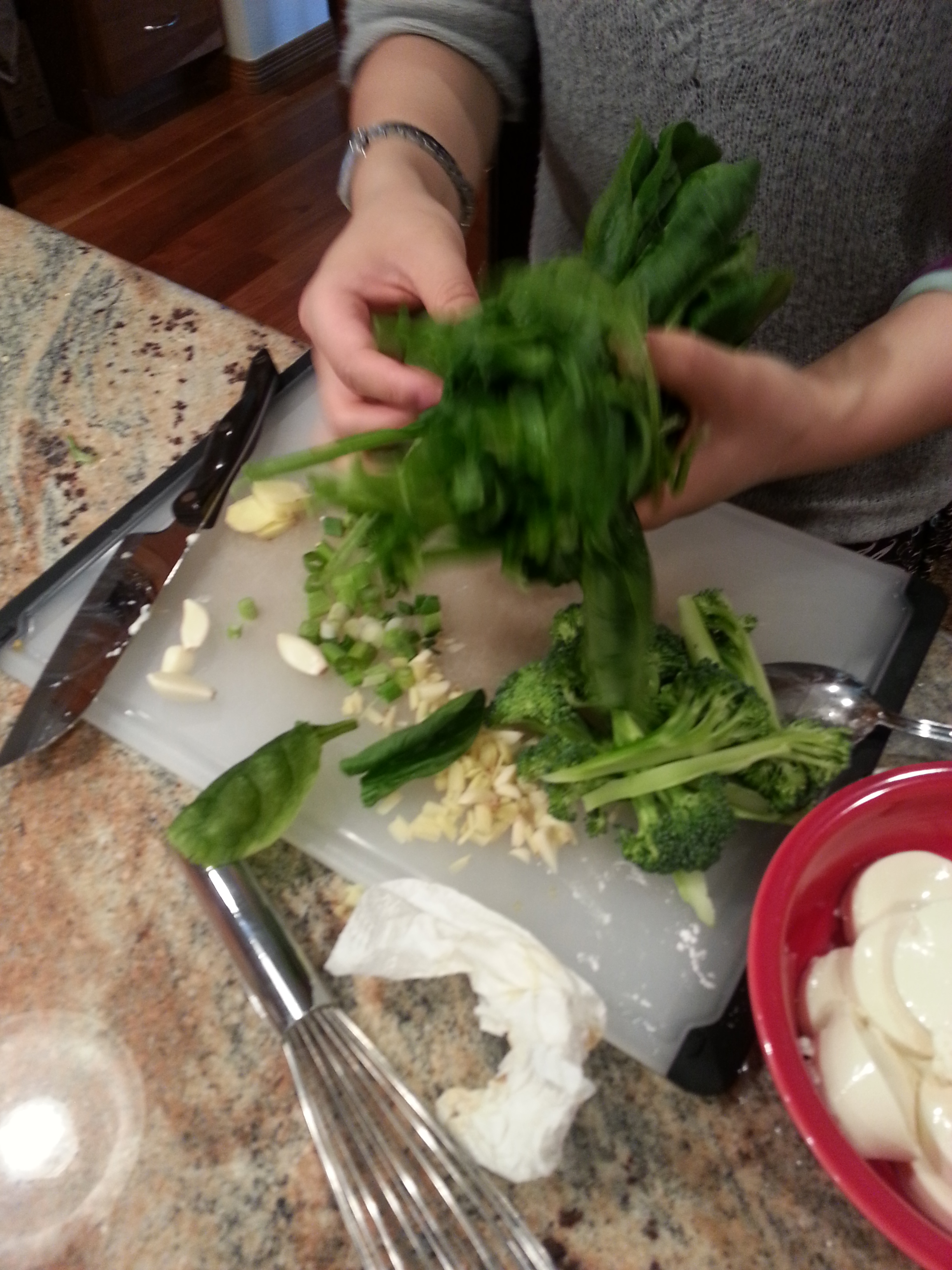 Wash and prep all of your fresh ingredients; ginger, garlic, green onions, tomato, little tiny mushrooms on long stems, spinach, and broccoli. Slice your hard soy bean curd (it looks just like cheese, and your soft tofu, which looks like ricotta cheese that holds its shape). Heat with a small amount of oil, we used about 2 tsp of canola, in the bottom of the soup pan. Add a few pieces of garlic, ginger, and about 1 TBS of sliced green onion. Heat until fragrant — the heat shouldn’t be browning these ingredients.