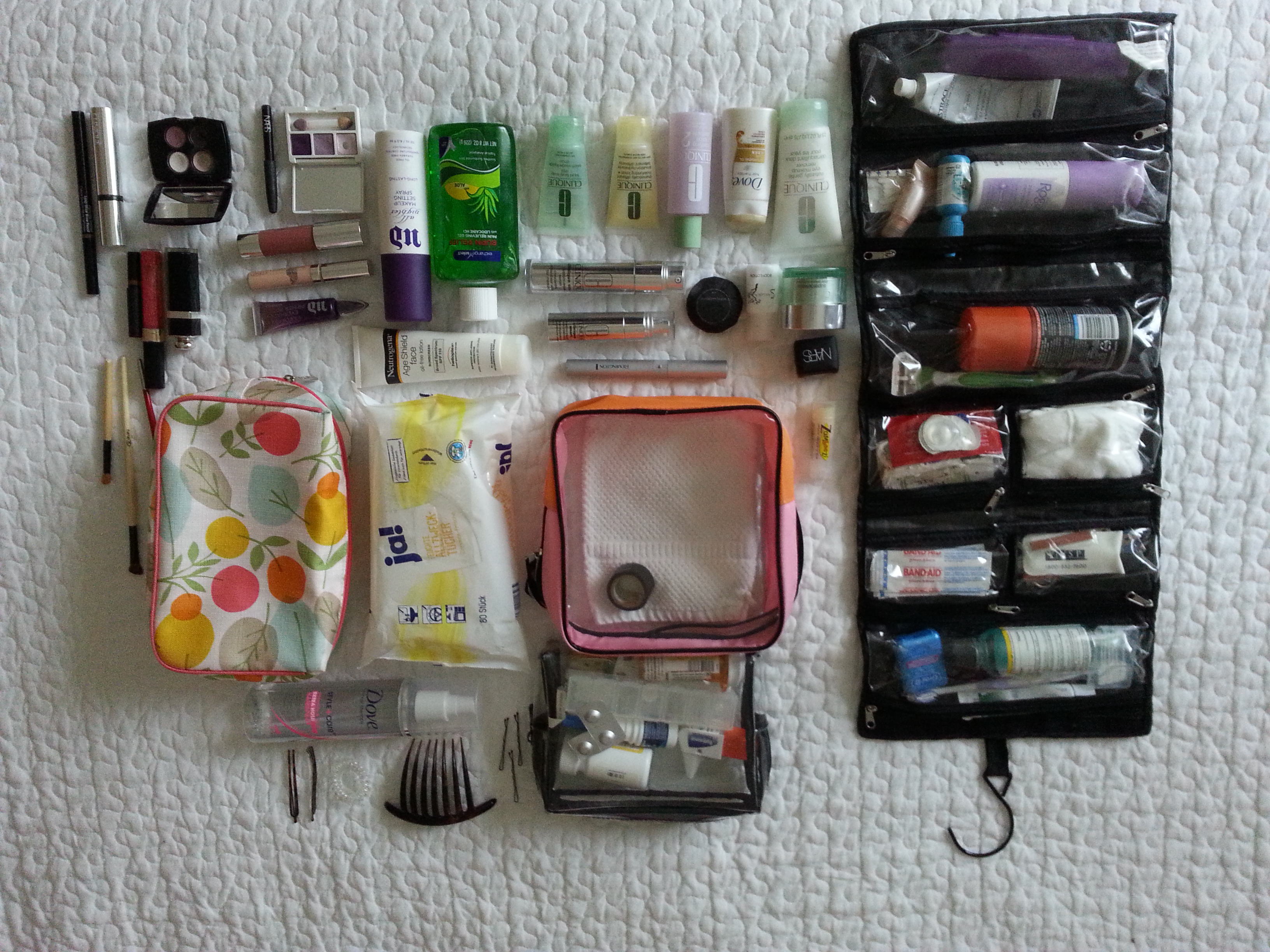 Being over 50 has some new guidelines for what is necessary to take on a long weekend for beauty & Rx medicine categories. Here is a bullet wardrobe reminder of what I “need” to be comfortable on a long weekend–that still comfortably fits into my one small suitcase. I rely on travel sized items, beauty samples, and premiums–those nice little extras that come with a cosmetic purchase. I also rely on my favorite brands and their special travel-sized, age/skin-type related items–I usually purchase some as I see the kits available, as well as ask for some as a gift idea every year! My go to is Clinique–the comfort of knowing how it smells (or doesn’t smell) as well as how my skin feels when I use it makes it part of my travel routine. You will see that I use many other brands for other “must-have” items, but I always come back to Clinique for the foundation of my skin care routine.