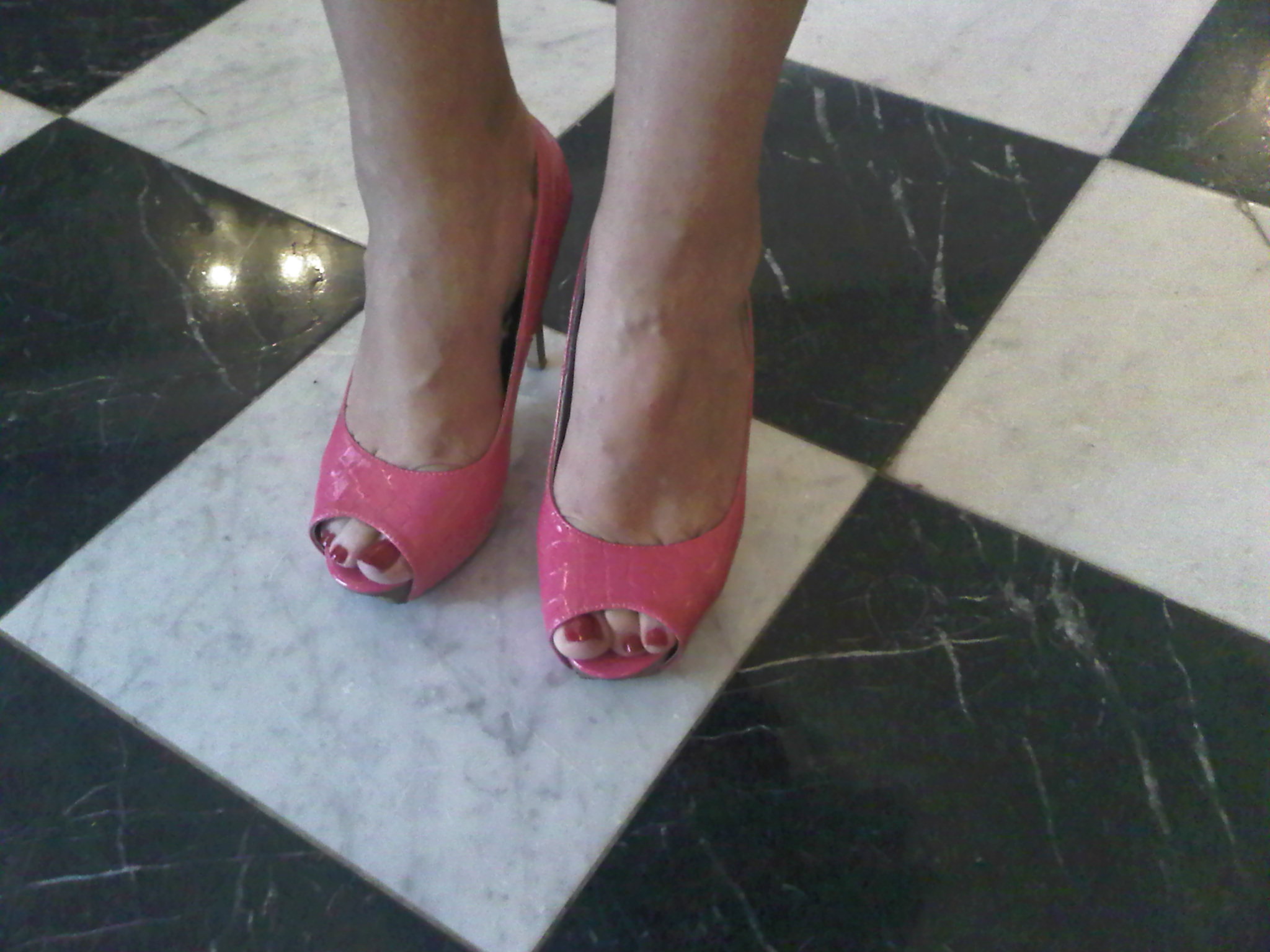 Pair no. 18 For the ladies who lunch, the pink ladies that is…these sky high beauties look mahvelous with the graphic black and white checkerboard marble floor in a French Quarter hotel.